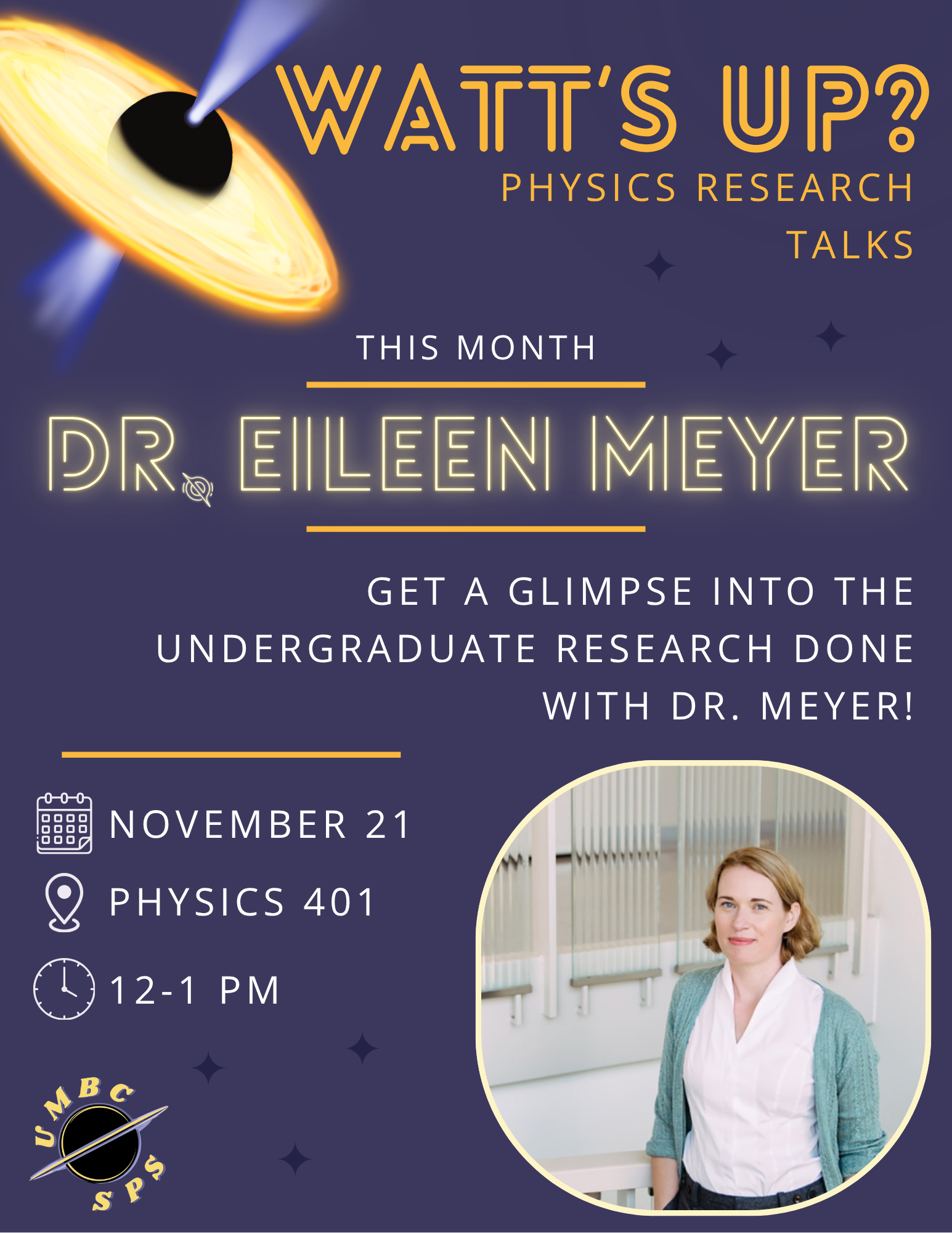 This Friday from 12-1p in Physics 401, the Society of Physics of Students will be hosting a talk with Dr. Eileen Meyer to discuss the undergraduate research done in her group here on campus!